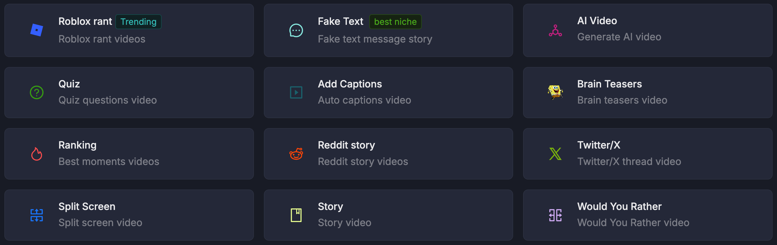 Reddit story (completed), AI videos(beta), ChatGPT story, would you rather video, fake text video,... join our discord server to stay up to date!
